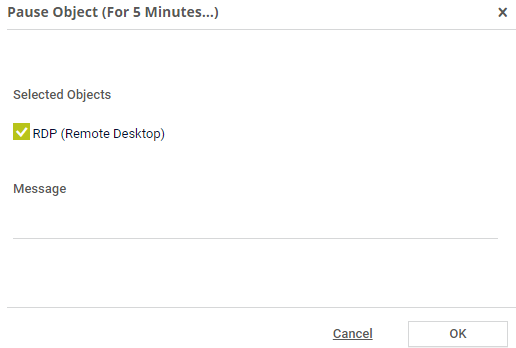 When you select a pause option, a dialog appears in which you can optionally enter a message. PRTG shows the message in the object's status message as long as the object is in the Paused status. Confirm with OK to pause the object.